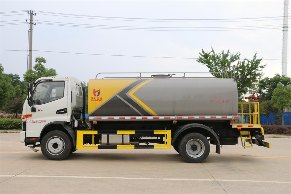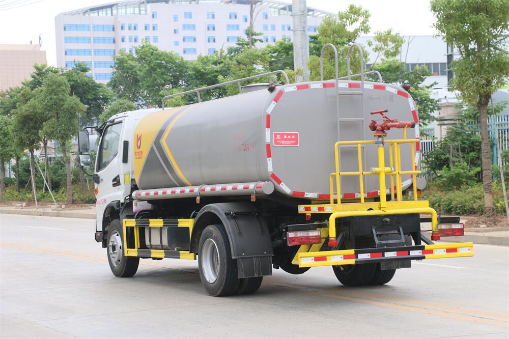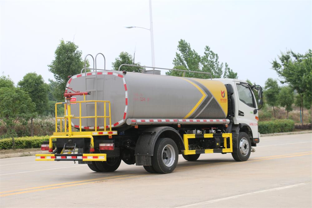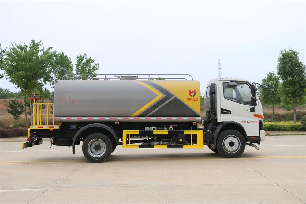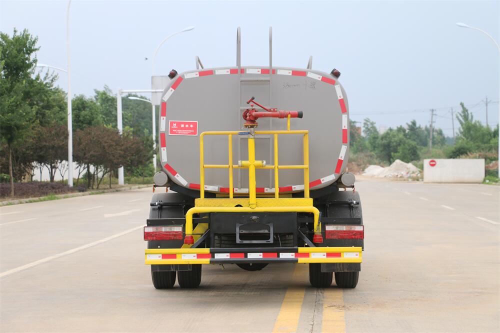 灑水車前裝有鴨形噴嘴或圓頭沖嘴,后面裝有圓柱開(kāi)灑水噴嘴或蓮蓬頭噴嘴,后部有一工作平臺(tái),裝配有水炮。后部還可裝8個(gè)噴嘴(選裝)。