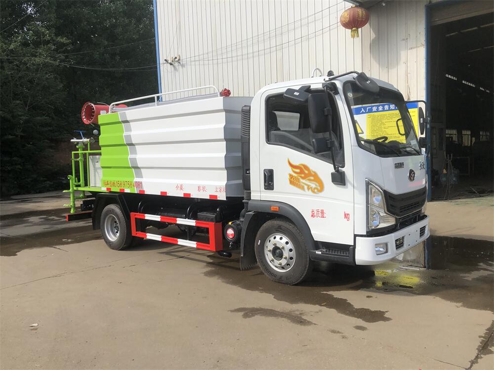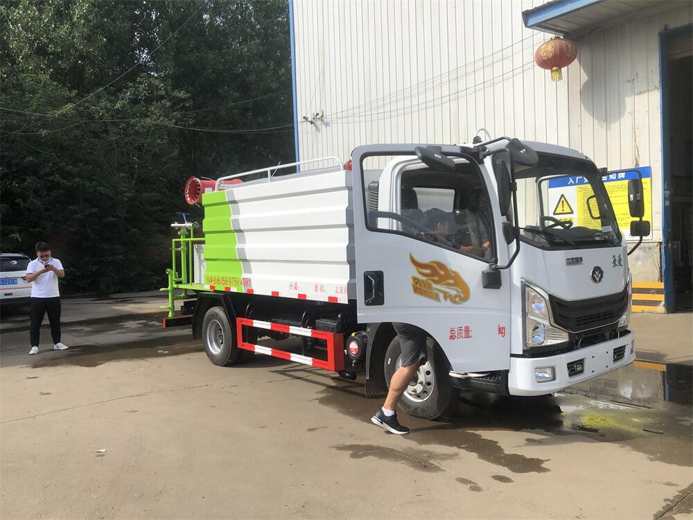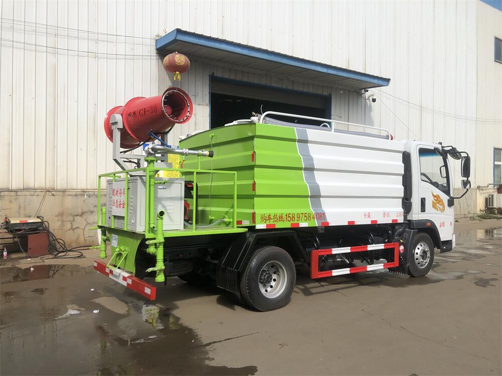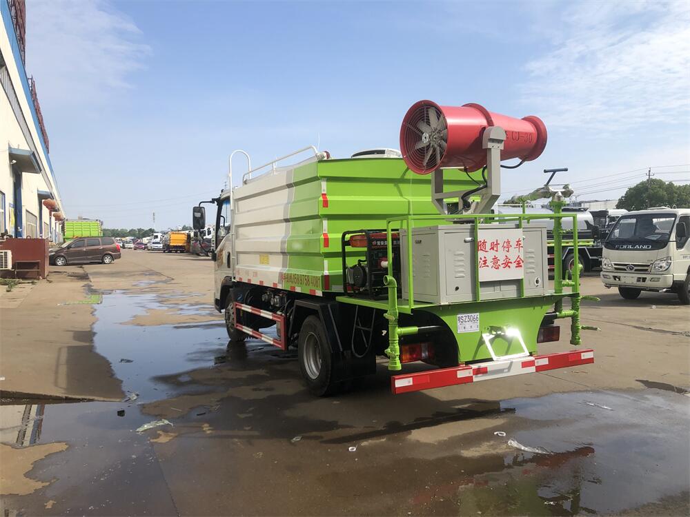 上裝配置:罐體容積為 5-7立方,選配風送式霧炮機組射程30米、40米、50米、60米、80米、100米、120米霧炮,罐體鋼板為4mm碳鋼Q235材質,罐內隔板具有防波作用,以減輕汽車行駛時罐體液體沖擊,罐體及整車外形尺寸按照公告。帶大功率專用灑水泵,泵可自吸自排,整車前沖、后灑、側噴、帶65消防接口,后平臺配CLW-50、CLW-60、CLW-80、CLW-100、CLW-120型風送式霧炮機組;罐體前封頭配大功率柴油發(fā)電機組;前封頭帶水位計,后平臺主管路帶1寸澆花接口,后爬梯。帶兩根輸水管及陰陽端。罐體顏色:銀/灰/綠,罐體兩側噴“多功能抑塵車”字樣,貼反光標示。