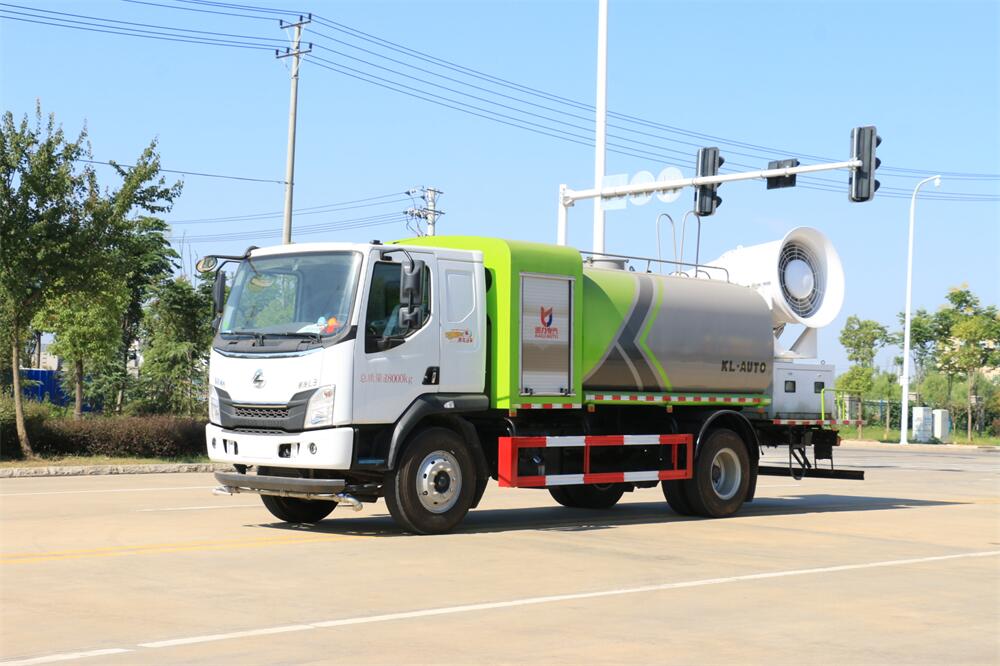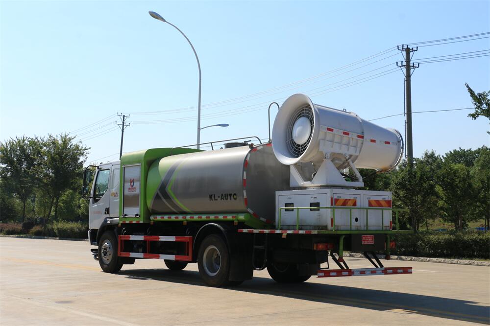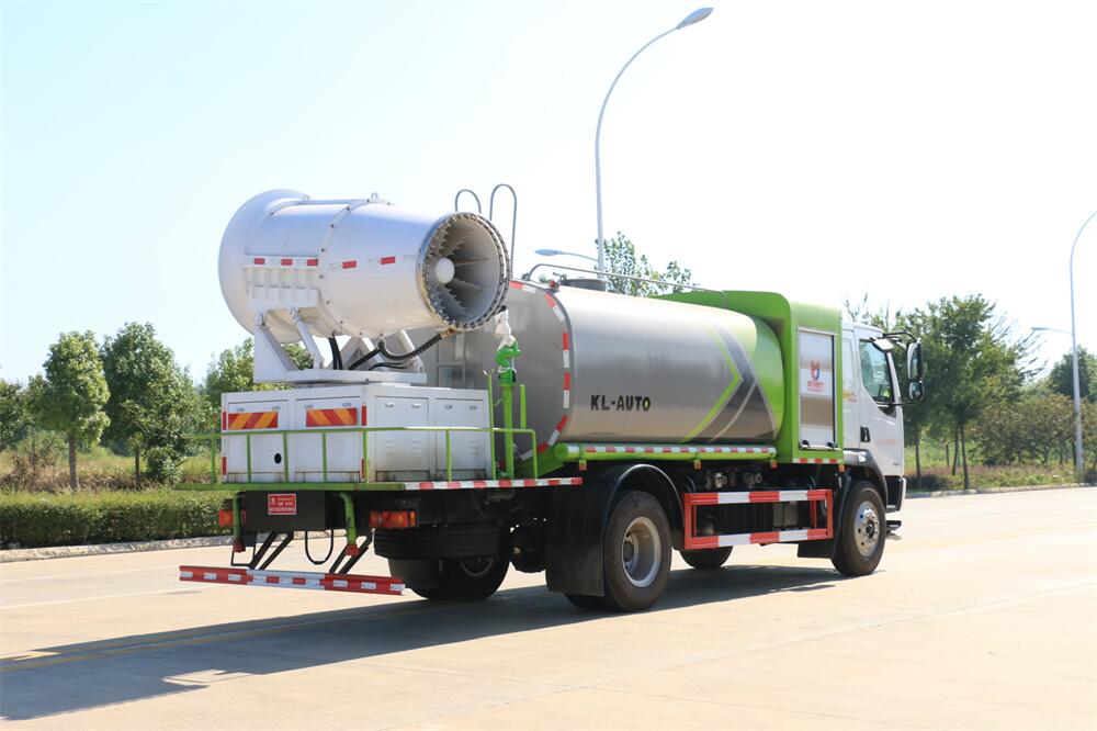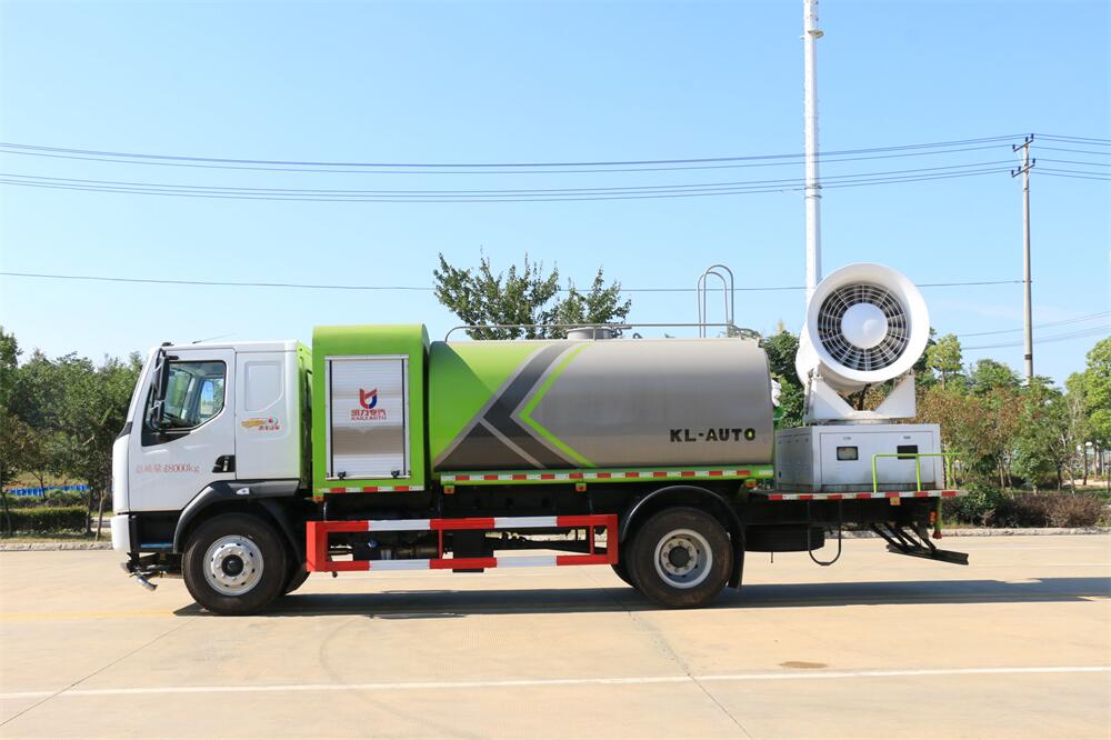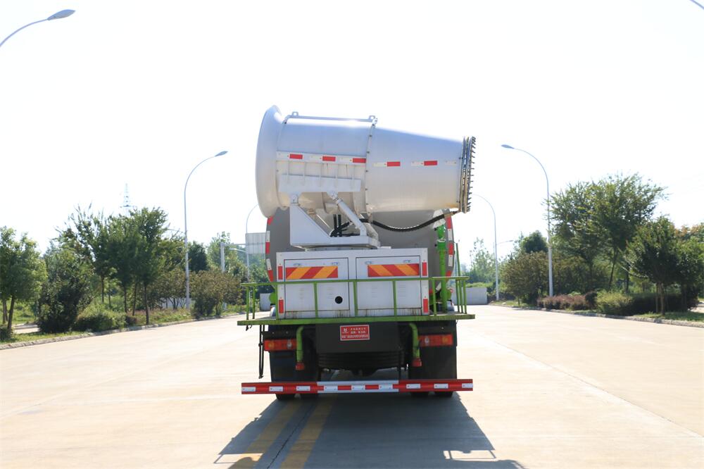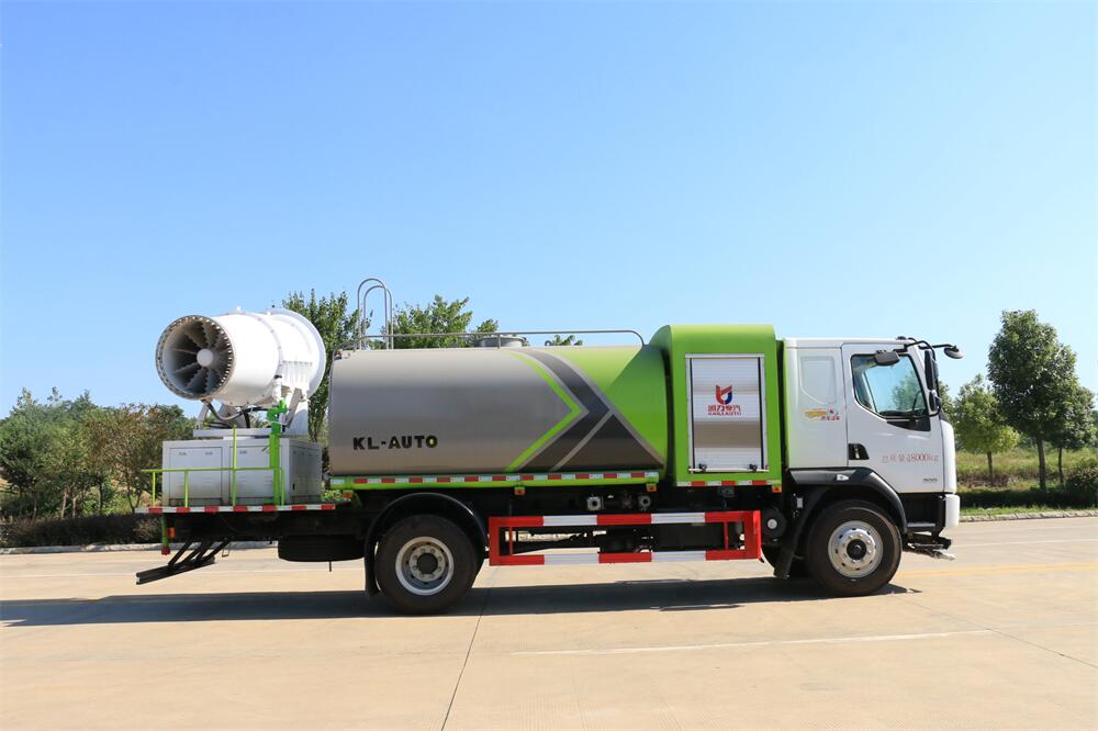 上裝配置:罐體容積為 12立方,選配風(fēng)送式霧炮機(jī)組射程30米、40米、50米、60米、80米、100米、120米霧炮,罐體鋼板為4mm碳鋼Q235材質(zhì),罐內(nèi)隔板具有防波作用,以減輕汽車(chē)行駛時(shí)罐體液體沖擊,罐體及整車(chē)外形尺寸按照公告。帶大功率專(zhuān)用灑水泵,泵可自吸自排,整車(chē)前沖、后灑、側(cè)噴、帶65消防接口,后平臺(tái)配CLW-50、CLW-60、CLW-80、CLW-100、CLW-120型風(fēng)送式霧炮機(jī)組;罐體前封頭配大功率柴油發(fā)電機(jī)組;前封頭帶水位計(jì),后平臺(tái)主管路帶1寸澆花接口,后爬梯。帶兩根輸水管及陰陽(yáng)端。罐體顏色:銀/灰/綠,罐體兩側(cè)噴“多功能抑塵車(chē)”字樣,貼反光標(biāo)示。