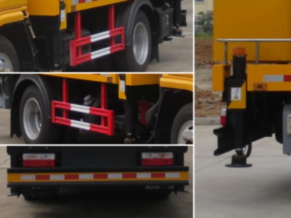 前伸:250mm,后伸:190mm;隨底盤選裝駕駛室;吊鉤為選裝件;側面防護及后下部防護裝置材料材質:Q235,連接方式:焊接加螺栓連接;后下部防護裝置斷面尺寸(寬贅?:30?00(mm),離地高度:390mm;ABS廠家及型號:襄陽東風隆誠機械有限責任公司/ABS/ASR-24V-4S/4M.