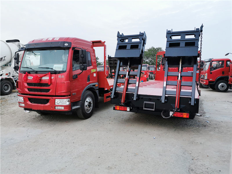 解放龍V單橋平板運輸車 一汽青島駕駛室 排放:國五新規 發動機:錫柴180馬力 變速箱:陜齒8檔 前后橋:145后橋 可選軸距:5米軸距 輪胎:900-20鋼絲胎 大梁: 250雙大梁 整車對應尺寸:9000*2500*2900 車型亮點:ABS防抱死系統 . 剎車間隙自動調整臂、防飛濺、中控鎖,遙控鑰匙,電動門窗,鋁合金油箱。 上裝采用五毫米花紋鋼板,100*100方鋼做橫梁,加強雙簧爬梯,可拉15噸以下挖機。 可選裝配置:液壓全自動爬梯,折疊型加長型液壓全自動爬梯,可加裝兩邊伸展,一邊可伸縮30公分。